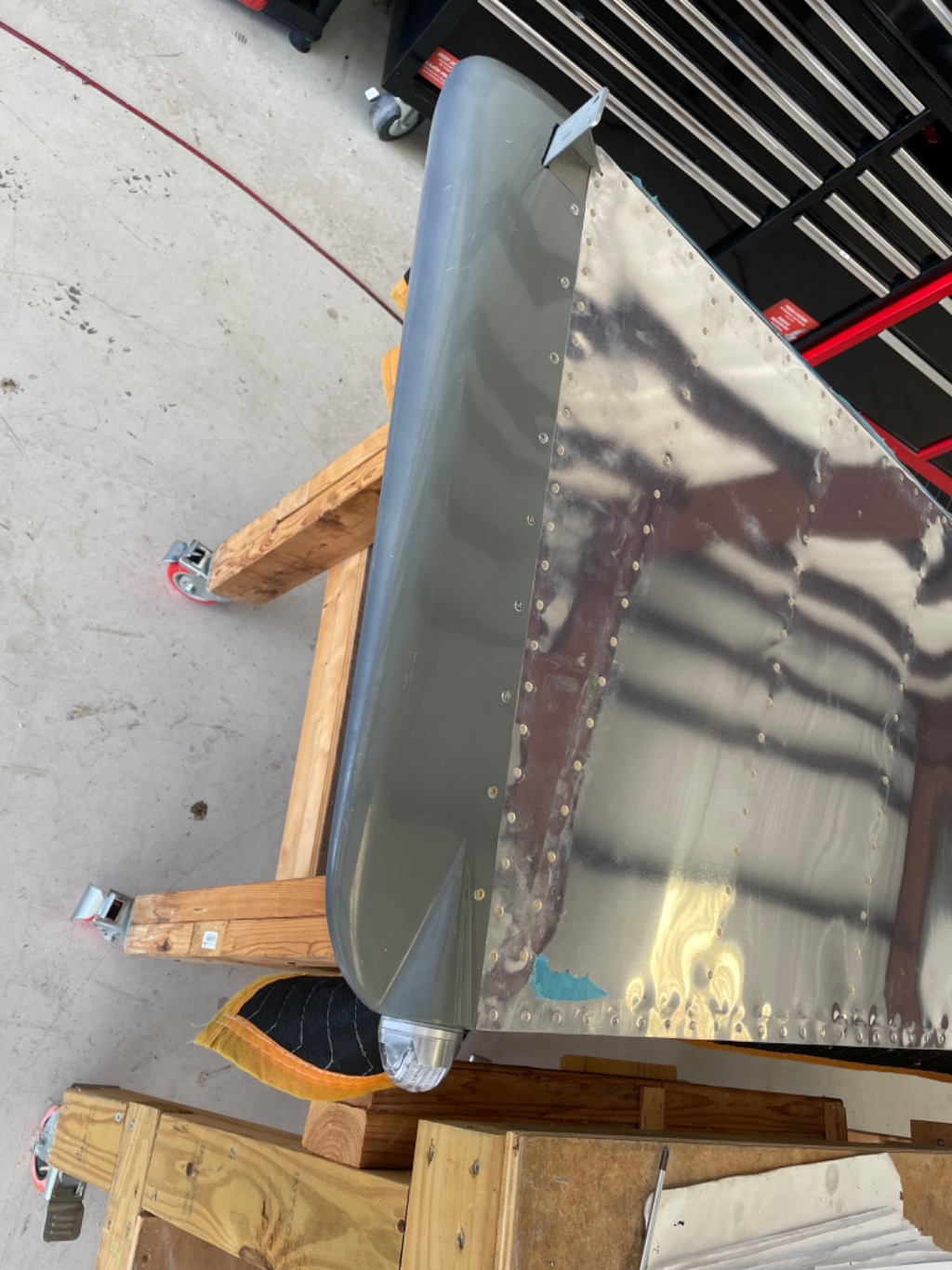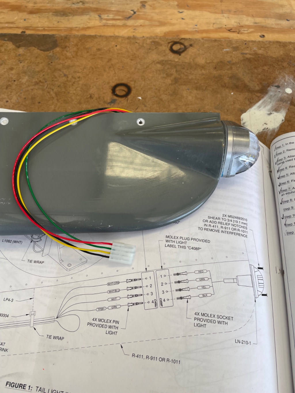 Wired one installed strobe light onto rudder. Temporarily installed onto rudder.