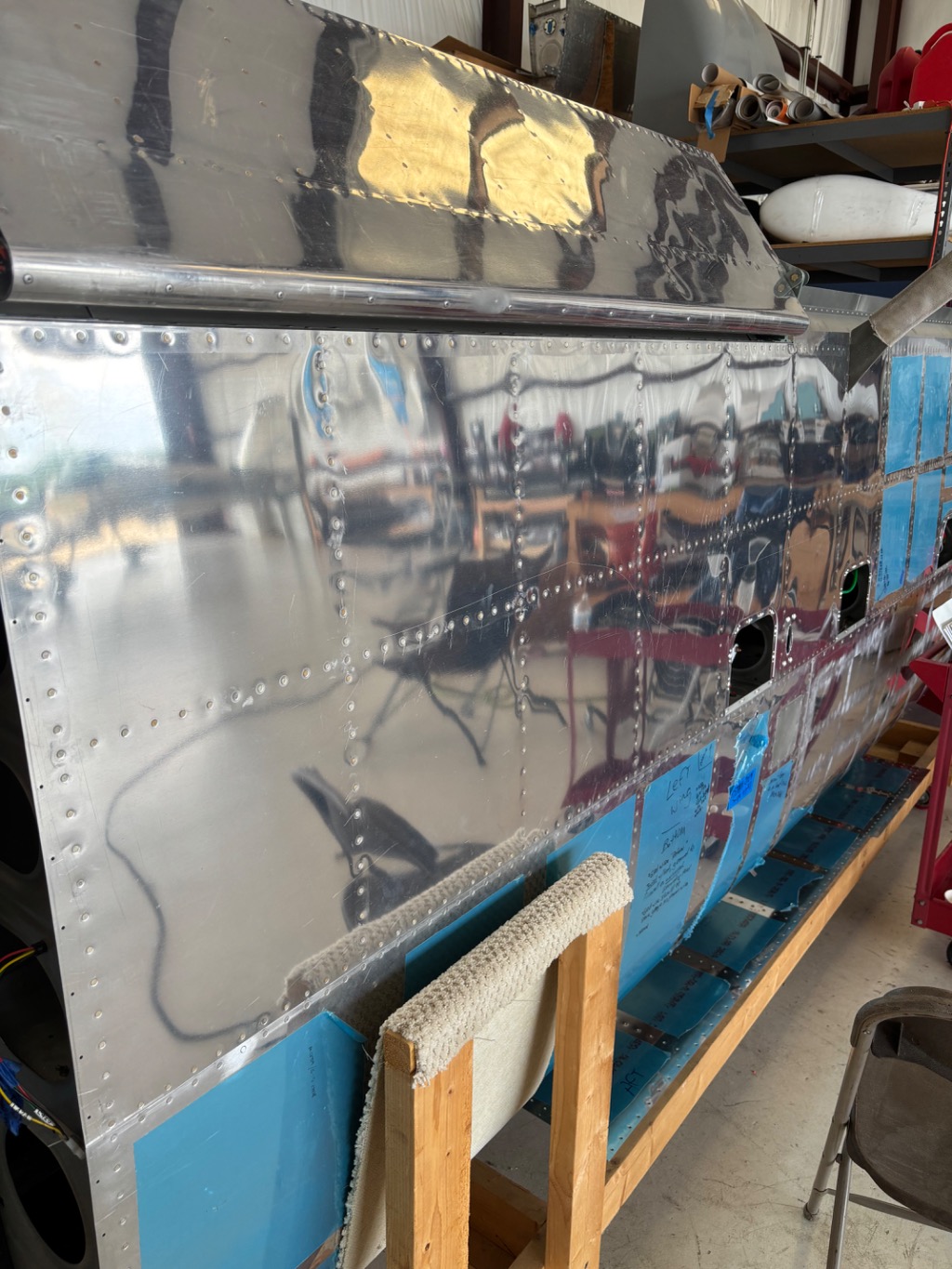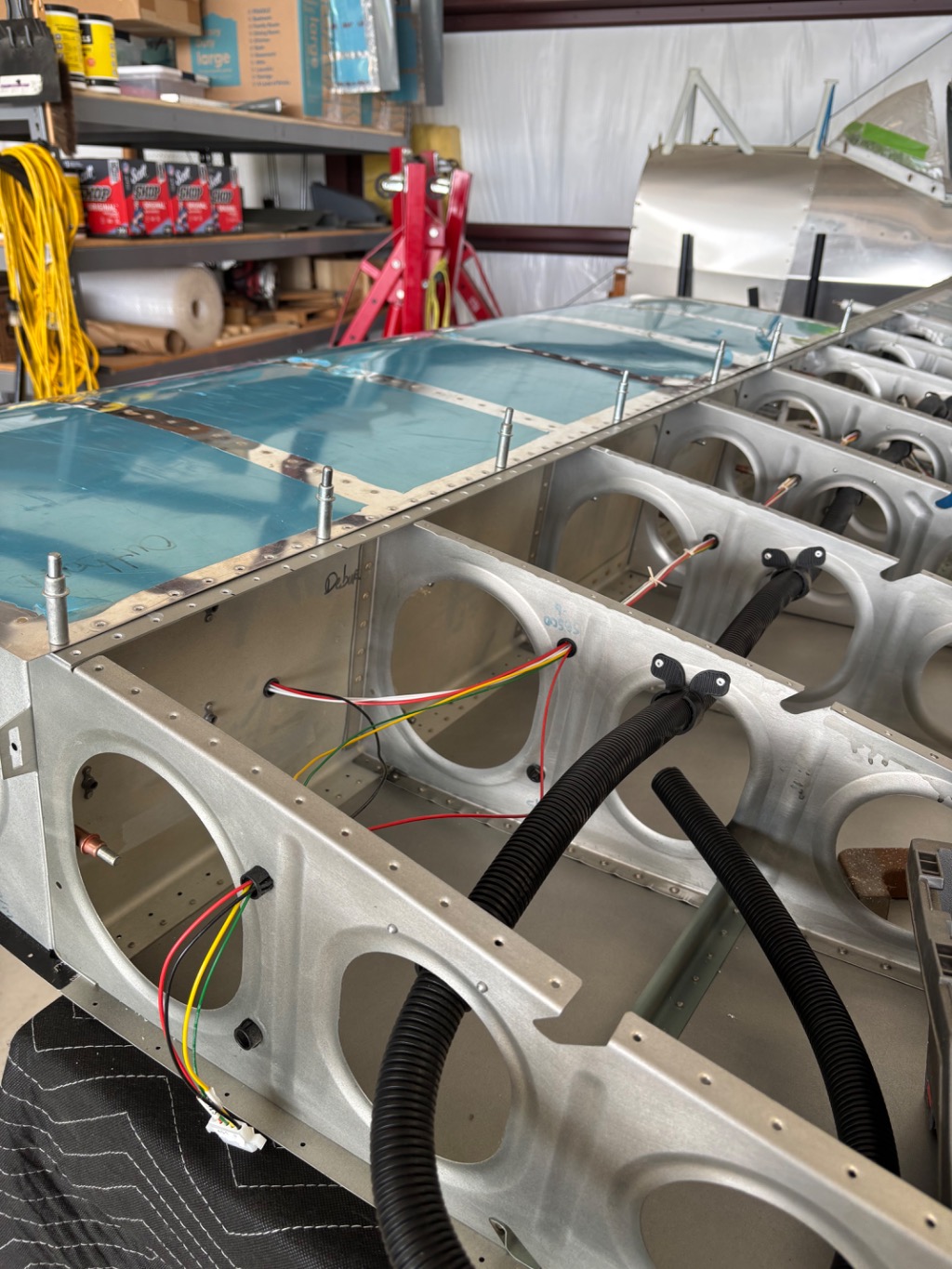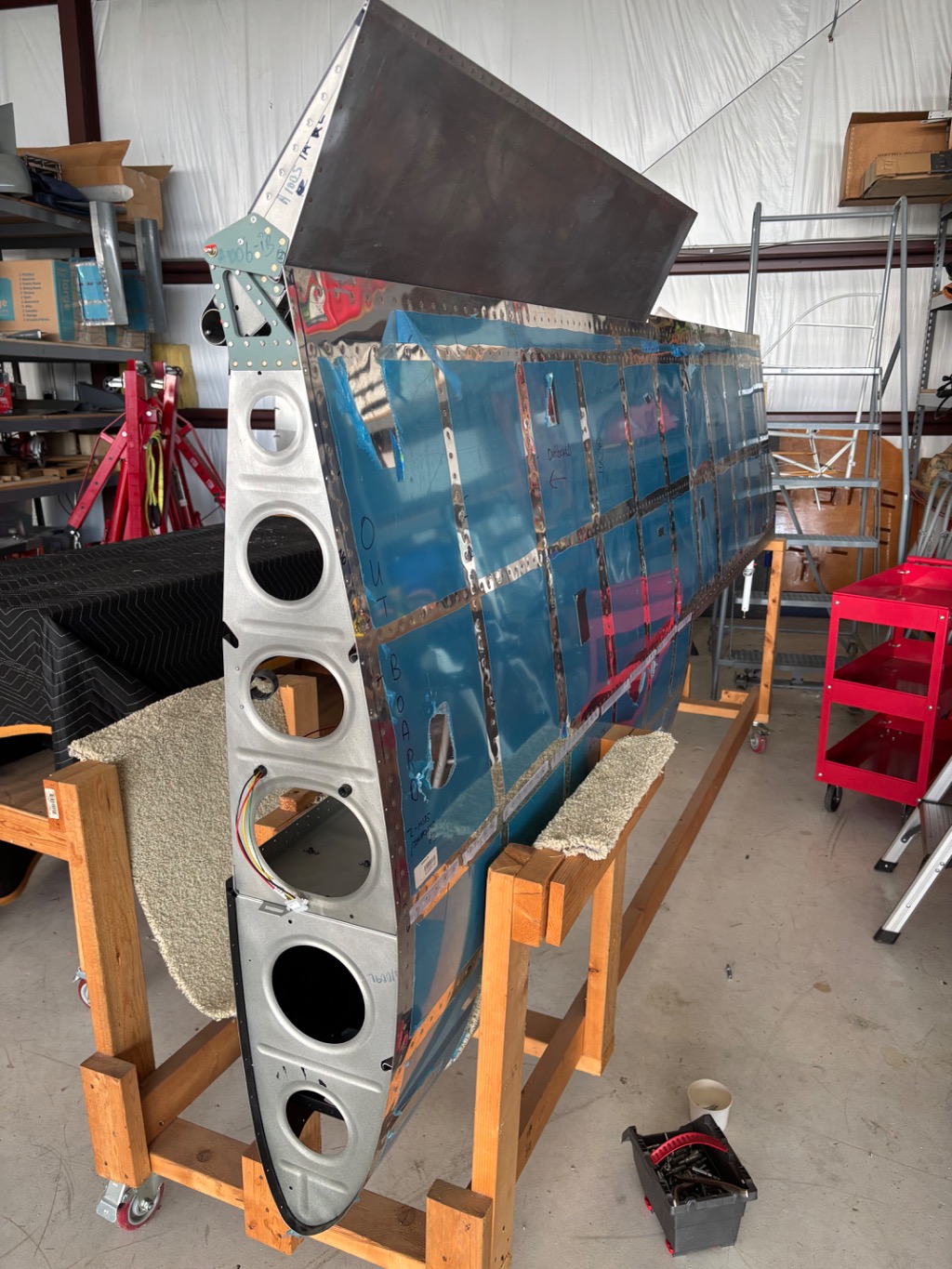 Finished riveting in bottom skin, drilled dimpled inspection covers, installed nut plates for inspection covers, reinstalled leading edge